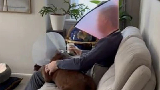 Алекс Морган решил составить компанию питомцу, который восстанавливался после операции на веке и носил на шее специальный защитный воротник, который не позволяет животному чесать швы. Мужчина из солидарности тоже надел на себя воротник и устроился на диване рядом с псом, при этом пытаясь пить чай.