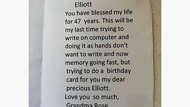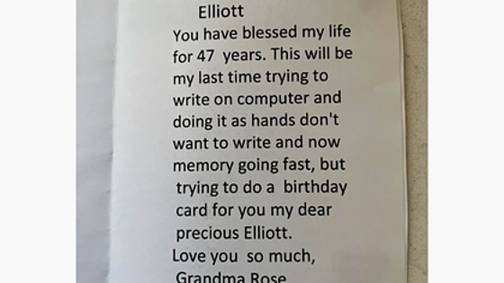 «С днем рождения, Эллиотт. Ты делал мою жизнь счастливой последние 47 лет. Это последний раз, когда я пытаюсь печатать на компьютере, потому что руки больше не слушаются меня, а память становится все хуже. Но я постаралась сделать эту открытку для тебя, мой дорогой Эллиот. Люблю тебя сильно», — гласил текст открытки.