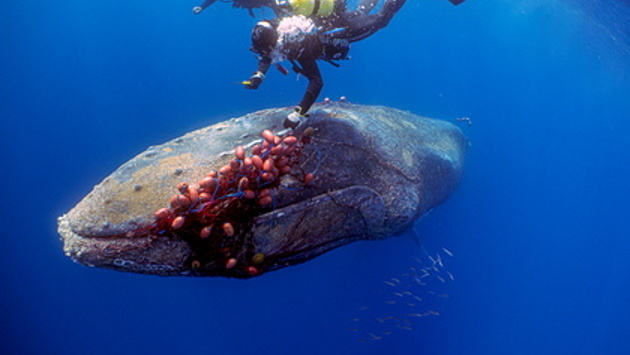 Дайверы спасли запутавшегося в рыболовной сети кита