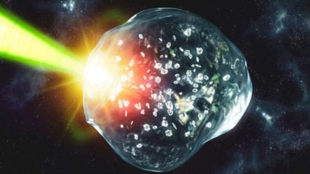 На планетах по всей Вселенной может идти дождь из алмазов, предположили ученые в пятницу после того, как с помощью обычного пластика воссоздали странные осадки, которые, как считается, образуются глубоко внутри Урана и Нептуна. Ученые ранее предполагали, что чрезвычайно высокое давление и температура превращают водород и углерод в твердые алмазы за тысячи километров под поверхностью ледяных гигантов. Теперь новое исследование, опубликованное в Science Advances, добавило кислород в смесь, обнаружив, что «алмазный дождь » может быть более распространенным явлением, чем предполагалось. Считается, что ледяные гиганты, такие как Нептун и Уран, являются наиболее распространенной формой планет за пределами нашей Солнечной системы, а это означает, что во Вселенной могут идти алмазные дожди. Доминик Краус, физик из немецкой исследовательской лаборатории HZDR и один из авторов исследования, сказал, что выпадение алмазов сильно отличается от дождя на Земле. Под поверхностью планет находится считается «горячей, плотной жидкостью», в которой диамо По его словам, алмазы формируются и медленно погружаются в скалистые ядра, потенциально размером с Землю, на глубине более 10 000 километров (6 200 миль). Хотя эти бриллианты могут не быть блестящими и ограненными как «красивый драгоценный камень на кольце», он сказал, что они были сформированы под действием тех же сил, что и на Земле. Стремясь воспроизвести этот процесс, исследовательская группа нашла необходимую смесь углерода, водорода и кислорода в легкодоступном источнике – ПЭТ-пластике, который используется для повседневной упаковки пищевых продуктов и бутылок. Краус сказал, что, хотя исследователи использовали очень чистый ПЭТ-пластик, «в принципе, эксперимент должен работать с бутылками Coca-Cola». Затем команда направила мощный оптический лазер на пластик. в Национальной ускорительной лаборатории SLAC в Калифорнии.