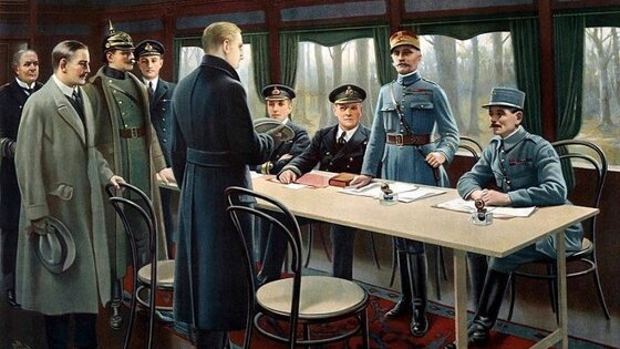 11 ноября 1918 года во Франции на станции Ретонд в Компьенском лесу представители Германии и стран Антанты заключили мирное соглашение. Так закончилась Первая мировая война. Немцы должны были в течение двух недель освободить оккупированные территории, установить на правом берегу Рейна нейтральную зону, передать союзникам орудия и транспорт и освободить всех пленных. Должны были отменить Брест-Литовский и Бухарестский мирные договоры. Впрочем, окончательные условия мирного договора были определены на Парижской мирной конференции в Версальском дворце 28 июня 1919 года.