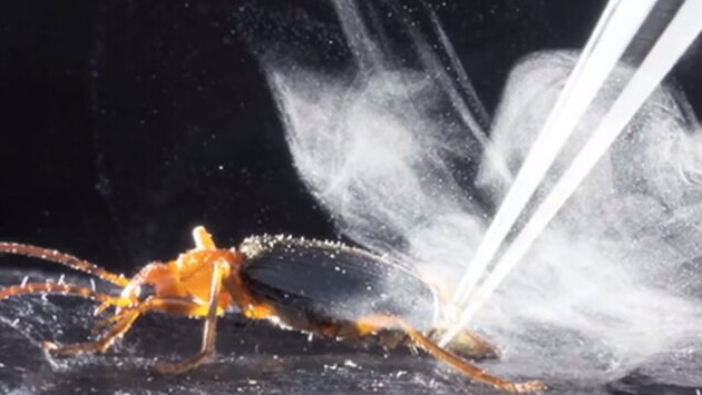 Жук-бомбардир умеет выпускать из задней части тела кипящую жидкость. Таким образом он отпугивает от себя хищников и других вредителей, например пауков или муравьев.