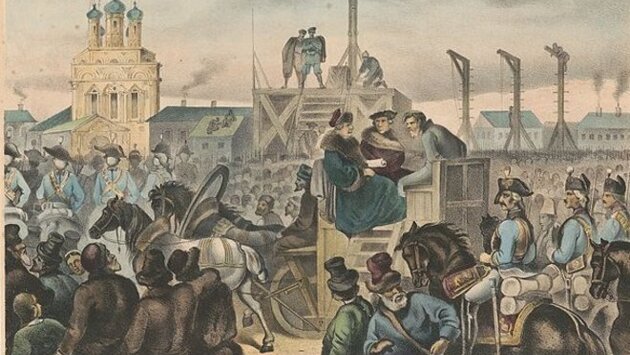 21 января 1775 года в Москве на Болотной площади казнили донского казака, предводителя Крестьянской войны 1773—1775 годов Емельяна Пугачева. Назвавшись "императором Петром III", он поднял восстание яицких (уральских) казаков, которое очень быстро превратилось в крупное крестьянское восстание, пожалуй, самое большое в истории дореволюционной России. Осенью 1774 года Пугачев был разбит в битве у Солениковой ватаги и с остатками войска бежал. Но он не знал о заговоре казацких полковников, решивших в обмен на выдачу заговорщика получить от правительства помилование. В сентябре 1774 года Емельян Пугачев был передан властям. В начале ноября его перевезли в Москву. Вместе с ним для генерального следствия были доставлены плененные участники восстания. Следствие велось особой следственной комиссией Тайной экспедиции Сената. После нескольких заседаний суд приговорил Пугачева к смертной казни.