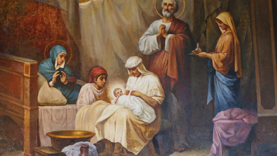 Согласно преданию, отец пресвятой Богородицы Иоаким был довольно состоятельным человеком, а его род восходил к царю Давиду. Однако детей у него не было, это не только считалось большим несчастьем, но и порицалось обществом. Однажды священник не разрешил Иоакиму принести жертву в храме. После этого он на сорок дней удалился в пустыню молиться и поститься, а жена его Анна молилась дома. Обоим супругам явился ангел, который возвестил о том, что у них вскоре родится дочь, назвать которую нужно Марией, а затем отдать на воспитание в храм.
