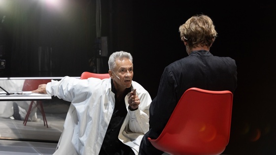 Скупой врачебный кабинет - стол, два стула. В этой обстановке, собственно, и разворачивается все двухчасовое действо, но внешнее - подчеркнуто лишь фон, создатели спектакля ведут зрителей в глубины человеческого сознания, со всеми их потаенными уголочками.