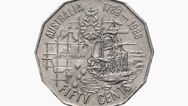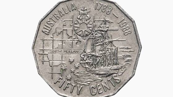 50-центовик был отчеканен к 200-летнему юбилею прибытия так называемого Первого флота — 11 кораблей из Великобритании, которые привезли в Австралию первых колонистов. В 1988 году все австралийские монеты номиналом 50 центов чеканились с изображением корабля Первого флота, розой ветров и очертаниями континента с одной стороны и профилем Елизаветы II — с другой. Однако неизвестное количество монет были отлиты с ошибкой — вместо корабля на них стандартно был изображен герб страны.