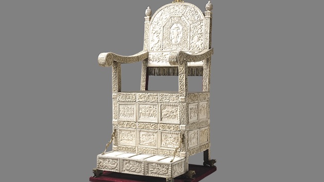 Еще один экспонат, также приписываемый царю Иоанну Грозному. А еще раньше его связывали с царем Иваном III. В "Историческом описании" 1807 года рассказано о привозе костяного трона великому князю Ивану III "послом греческих царевичей" по случаю его женитьбы на византийской принцессе Софье Палеолог, но историк Алексей Малиновский в своем труде не ссылается при этом ни на какие источники. Трон сделан в XVII веке. И как и другие троны, мог использоваться в торжественных церемониях, к примеру, при приеме послов.