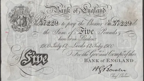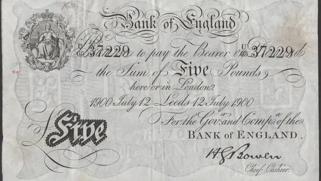 На аукцион была выставлена банкнота номиналом пять фунтов стерлингов, выпущенная отделением Банка Англии в Лидсе в 1900 году. Ее отличительный признак — подпись Хораса Боуэна, который был главным кассиром Банка Англии с 1893 по 1902 год. Уцелели лишь несколько купюр с такой подписью, и все они хранятся в частных коллекциях.