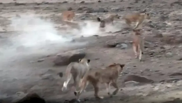 Львицы попытались поймать детёныша гиены, отбившегося от стаи. Взрослые особи вступились за своего маленького соплеменника и атаковали одну из хищниц.