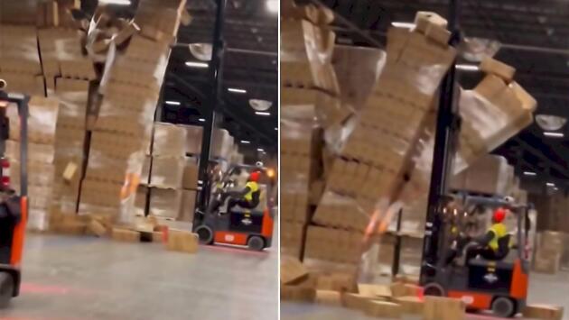 Неудачливый работник склада обрушил штабель с телевизорами и попал на видео