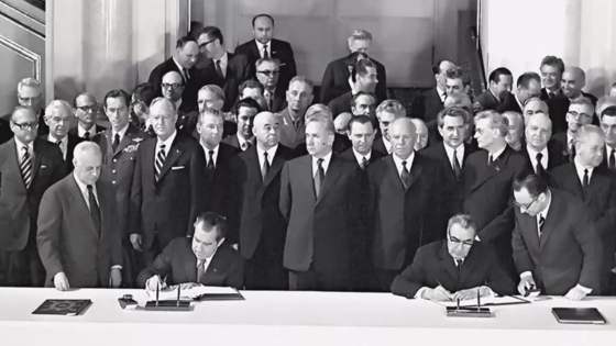 В мае 1972 г. во время визита президента США Ричарда Никсона в Москву были подписаны Договор об ограничении систем противоракетной обороны (ПРО)2 и Временное соглашение по ограничению некоторых стратегических наступательных вооружений (ОСВ-1). Важным шагом в сотрудничестве двух стран стала стыковка космических кораблей "Союз" и "Аполлон" в июле 1975 г.