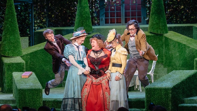 Историю играют в декорациях буколической Англии. Ядовито-зеленый искусственный газон изображает лабиринты сада в доме Чеснэя. Зато платья, сшитые в стилистике викторианских кринолинов пусть и не с исторической точностью, подчеркнуто театральны. Отдых для глаз зрителей, порядком уставших от безликих костюмов и таких же серо-черных коробок сцены.