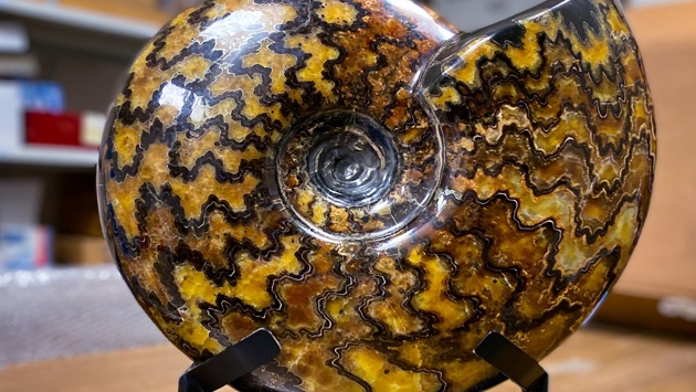 Но не только древность и размер делают уникальной эту окаменелость. Новый экспонат потрясающе красив. Одна из его сторон переливается ярким перламутром от красно-оранжевого до желтого цвета с оттенками зеленого. Такой эффект радужного сияния дает слой карбоната кальция - аммолита, довольно редкого драгоценного камня органического происхождения.