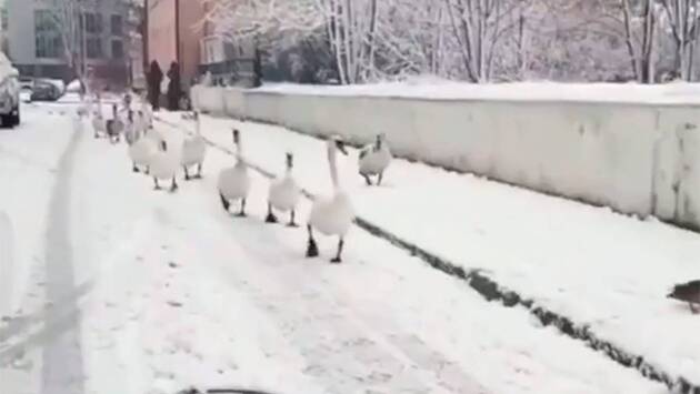 Жители Балтийска, расположенного в Калининградской области, засняли лебедей, которые маршировали строем по улицам города. Кадры публикует РИА Новости в своем Telegram-канале.