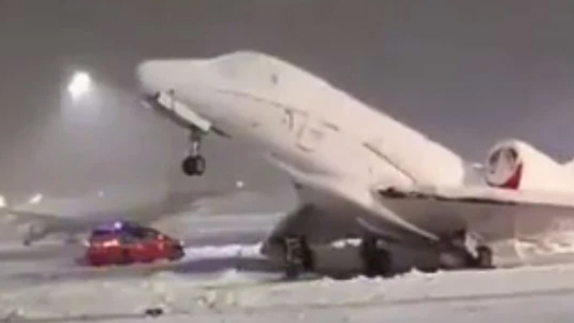 На видео, опубликованных в соцсетях очевидцами, можно увидеть, что к взлетной полосе в основном примерзла задняя часть лайнера, а нос приподнялся.