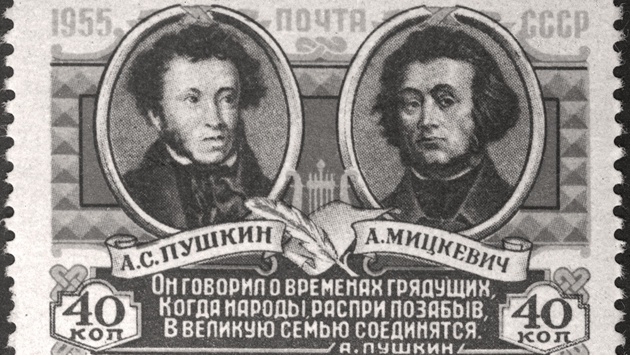 В 1955 году в СССР была выпущена марка в 40 копеек, на которой изображены вместе Пушкин и Мицкевич и приведены строки Пушкина о своем польском товарище по перу: "Он говорил о временах грядущих, / Когда народы распри позабыв, / В великую семью соединятся..."