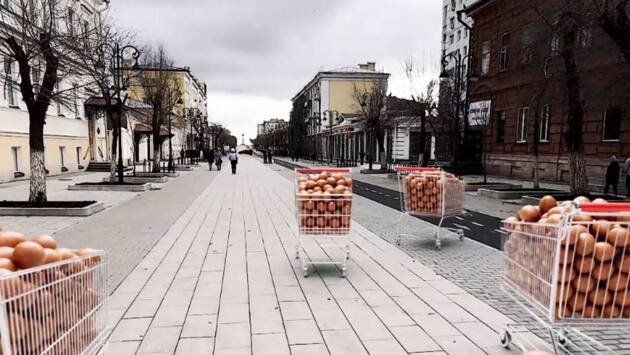 Для создания видео авторы применили анимированные эффекты. В нем видно, как по ул. Советской катятся покупательские тележки, в которых лежат куриные яйца.