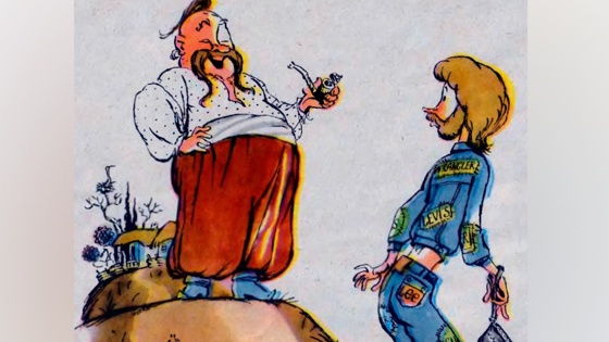 Хорошие зарубежные джинсы по-прежнему стоили дорого, достать их было трудно и отдать за "фирму" готовы были многое. В связи с этим в журналах и газетах тех времен появлялось множество рисунков на тему.