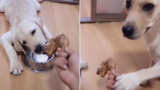 Владелица собачьего семейства запечатлела, как пёс предотвратил процесс заигрывания с щенком и, отобрав курицу, аккуратно положил её в миску.