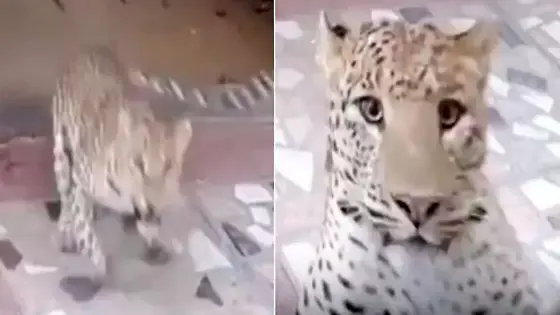 Молодой леопард, путешествующий по индийской деревне, забрался в частное владение и заблудился.