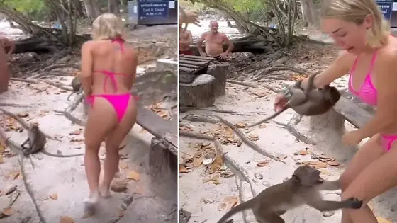 Эмми Расс, немецкая блогерша, снискавшая себе известность в узких кругах, благодаря эпатажным выходкам и съёмке в популярном в Германии реалити-шоу, решила навестить обезьянок в заповеднике Monkey Beach, находящемся на тайском острове Пхи-Пхи.
