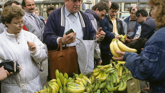 С годами бананы стали завоевывать сердца и желудки советских людей. За бананами — стоили они 1 рубль 10 копеек за килограмм — выстраивались в Москве огромные очереди. В одни руки обычно давали не больше пары килограммов. И потому к покупателям, подходившим к прилавкам, часто присоединялись родственники, знакомые, соседи. Рук становилось гораздо больше, и эти компании уходили из магазинов с туго набитыми авоськами — усталые, но довольные.