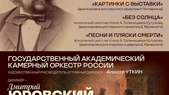 Спустя полтора столетия музыка русского гения Модеста Петровича Мусоргского по-прежнему актуальна и ставит перед исполнителями много загадок. На этот раз дирижёр Дмитрий Юровский предстанет не только как исполнитель, но и как соавтор Мусоргского. В его версиях для струнного оркестра прозвучат вокальные циклы "Без солнца" и "Песни и пляски смерти" на стихи А. Голенищева-Кутузова. Еще один цикл – знаменитые "Картинки с выставки" для фортепиано – будет исполнен в аранжировке для струнного оркестра Р. Пэттерсона. "Моё отношение к Мусоргскому более чем трепетное, более чем восторженное, – говорит Дмитрий Юровский. – С тех пор, как я стал исполнять его сочинения именно в первоисточнике, а не в редакциях Римского-Корсакова, Глазунова, даже Шостаковича, я особенно оценил гений этого композитора. Выбор обработок, которые мы представим в нашей программе, имеет свой смысл. Состав "струнные и ударные", который я взял для цикла "Песни и пляски смерти", отсылает нас к Четырнадцатой симфонии Шостаковича, это мой поклон ему. "Без солнца" – чисто струнное звучание. А для "Картинок с выставки" я выбрал версию Роберта Пэттерсона, потому что она наиболее академично передаёт характер замысла Мусоргского, показывает его чистый стиль, не наслаивая собственные ассоциации. В любом случае комбинация этих трех циклов в одной программе сама по себе уникальна, и, надеюсь, откроет что-то новое для почитателей творчества композитора."