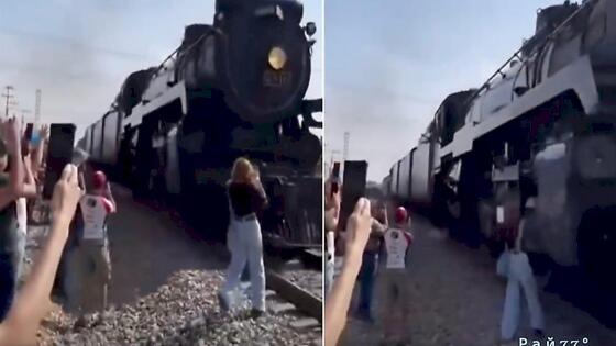 Раритетный паровоз Canadian Pacific 2816, прибывающий к одной из мексиканских станций, чуть не сбил отчаянную экстремалку.