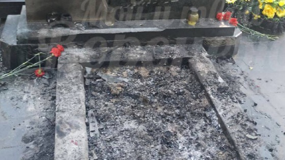 Фотографии с места происшествия свидетельствуют о возгорании. Однако следов ударов и иных признаков вандализма на снимках не видно. Памятник и могильная плита получили повреждения от воздействия огня.