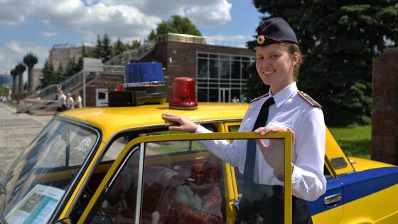 Всех гостей праздника встречали курсанты Московского университета МВД России имени В. Я. Кикотя, которые представляли ретротехнику — советские машины, на которых когда-то работали милиционеры. Будущая защитница правопорядка Мария Тамбовцева стоит рядом с ВАЗ-2101 — знаменитыми «Жигулями». Девушка рассказывает, что она с детства мечтала стать следователем и захотела поступать в Университет МВД после того, как прочитала детективы Александры Марининой. Очень уж вдохновила девушку главная героиня — Анастасия Каменская.