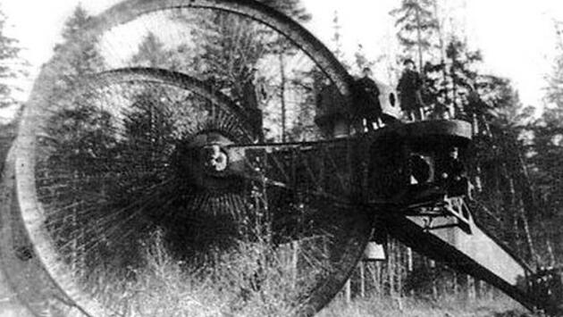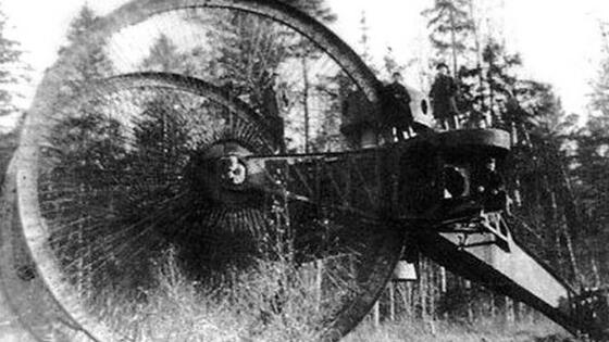 Объясним всё особым энтузиазмом, военным временем, патриотизмом и всем прочим. В общем, в лесу появилось нечто, высотой около десятка метров, с двумя немецкими моторами внутри. Кстати, где именно они стояли и как приводили в движение колёса тоже непонятно. Но не суть.