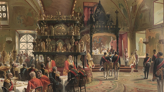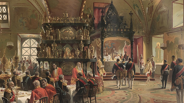 Императрица стояла посреди зала, члены Государственного совета, польщенные приглашением, целовали ей руку, император пожимал им руки. Потом обедня в церкви и гости рассаживались за круглые столики по 10 человек.