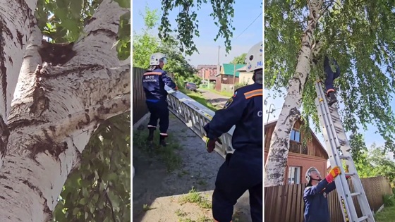 С рассветом к пленившей кошку берёзе была приставлена раздвижная лестница, по которой один из спасателей взобрался на необходимую высоту и вернул животное на землю, после чего передал в руки заботливой хозяйки.