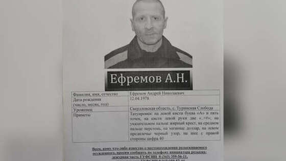 На севере Свердловской области из колонии-поселения сбежал заключенный. Ориентировку на беглеца разместили в паблике "Подслушано Ивдель News" во "ВКонтакте". Андрей Ефремов 1978 года рождения самовольно покинул колонию-поселение при ИК-63 в Ивделе. Мужчина был одет в черную с капюшоном олимпийку, в черную куртку с коротким воротником и красной полоской на нем, а также синие джинсы и кирзовые сапоги. Также в объявлении о розыске говорится об особых приметах преступника: на левой кисти у мужчины набита буква "А" и пять точек, на указательном пальце - большой крест, на среднем пальце - перстень, на мизинце - доллар. Также у заключенного есть татуировка в виде черного узора на левом предплечье и цифры сорок с правой стороны шеи. До этого в Екатеринбурге заметили Химмашевского стрелка, который освободился из колонии на 15 лет раньше.