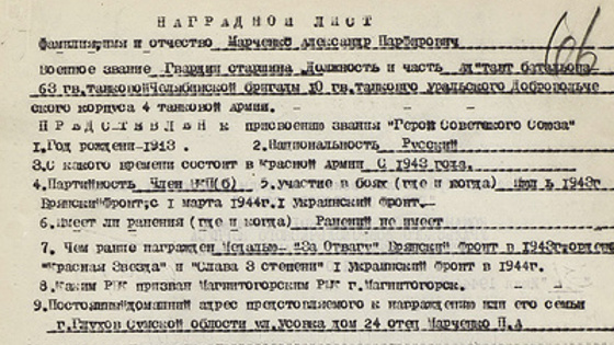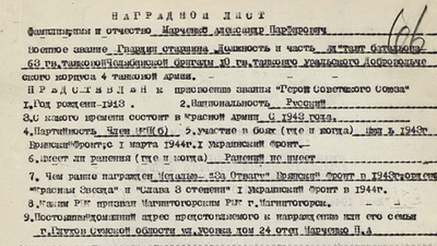 Как следует из архивных документов, опубликованных в новом мультимедийном разделе Минобороны, Марченко пошел на войну добровольцем и в боях за Львов был назначен адъютантом 2-го танкового батальона.