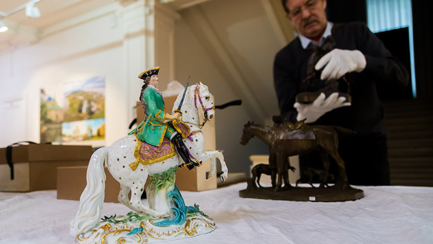 Прежде чем на третьем этаже Новосибирского художественного музея начнется монтаж выставки, идет официальная приемка экспонатов. Реставраторы с документами разворачивают и осматривают каждый предмет. Фарфоровую Екатерину II на коне Бриллианте можно брать только голыми руками – статуэтка может выскользнуть из перчаток, а парадную шубу лейб-кучера хранят завернутой в несколько слоев тонкой бумаги.