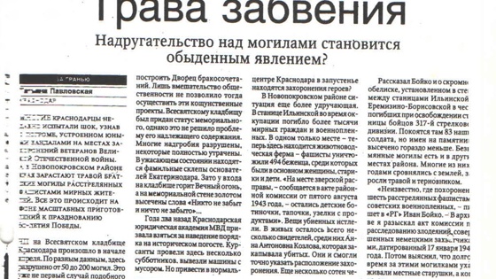 "Трава забвения" - так назывался материал, вышедший в "РГ" 15 апреля 2005 года. Мы написали о трагедии в здешней станице Ильинской, где фашисты сбросили в глубокий ров почти 500 беженцев - женщин, стариков, детей. Спастись не удалось никому, поэтому о месте массового захоронения долгое время ничего не было известно. Краеведу удалось разыскать архивные документы, которые помогли восстановить хронологию страшных событий, о чем рассказала газета.