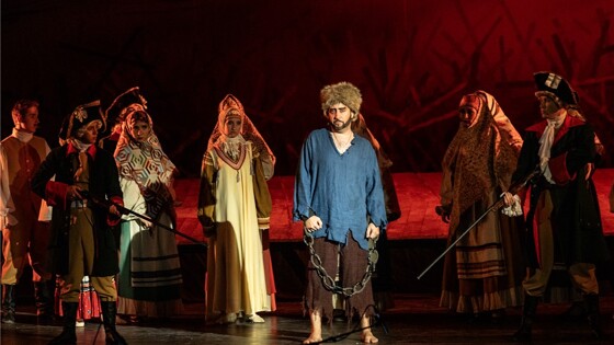 Инициатор всероссийского форума "ВИДЕТЬ МУЗЫКУ" – Ассоциация Музыкальных Театров при финансовой поддержке Министерства культуры Российской Федерации. Проект реализуется при поддержке Президентского фонда культурных инициатив. Лауреат Российской национальной театральной премии "Золотая Маска" композитор Евгений Загот подарил отечественной сцене музыкальную историю драматических событий русского бунта Емельяна Пугачёва. Либретто написал поэт, драматург Карен Кавалерян. Теперь "Капитанская дочка", как национальный образец жанра мюзикла с русскими корнями, привлекает многие российские театры и пользуется успехом у публики, в особенности школьной аудитории. "ВИДЕТЬ МУЗЫКУ"-2024 в своей афише имеет три варианта мюзикла Загота "Капитанская дочка": от Ивановского музтеатра, Московского театра "Поколение", Театра музыки, драмы и комедии Новоуральского городского округа. Премьера постановки мюзикла "Капитанская дочка" на родной Ивановской сцене состоялась в ноябре 2023 года. Своё прочтение пушкинского романа гастролёры решили вынести на суд фестивального зрителя. По условиям всероссийского смотра музыкальных театров "ВИДЕТЬ МУЗЫКУ" коллективы сами выбирают спектакль для показа в столице. В мюзикле Загота-Кавалеряна ярко прослеживается любовная линия романа, а именно, любовный треугольник Гринёв-Маша-Швабрин. На этой составляющей сделан акцент и в постановке режиссёра Антона Лободаева, который точно следует законам жанра. Лирика подчёркнута красивыми дуэтами, сольными номерами Гринёва (Савелий Лосев) и Маши (Алёна Каржонова), в которых повторяется лейтмотив их любви. Швабрин (Максим Денисов), с недобрым смехом, сопровождающим все его реплики, превращён в настоящего злодея, раскаявшегося в финале. Тема бунта Емельяна Пугачёва, упрощённая и сжатая, сделана схематическим каркасом повествования. Образ Пугачёва, драматургически уступающий приоритету образа Петра Гринёва, приобрёл дополнительную значительность благодаря фактурной внешности Максима Галенкова. Также густой, глубокий баритон исполнителя усиливал лидерский эффект предводителя массового восстания и одновременно благородной личности - вроде и разбойник, а человек понимающий, натура широкая. В заключительном номере Пугачёв-Галенков веско бросал в зал слова: "Всё не зря было, я пришёл к вам с добром, помните это". Изящный Гринёв-Лосев, контрастирующий по-мужицки крупному облику Пугачёва, стал любимцем публики. Миловидный облик артиста, его доверчивая искренность чрезвычайно импонировали и создавали по-пушкински привлекательный образ юного поручика, внешне схожего с кинообразом гардемарина-Харатьяна из популярного телефильма Светланы Дружининой. Зрители с большим чувством удовлетворения зааплодировали в долгожданный момент поцелуя Гринёва и Маши, радуясь за чистого душой юношу. Даже не достаточно хорошо обработанный голос артиста воспринимался проходящим признаком неопытности героя. Маша-Каржонова в финальной сцене разоблачения Швабрина с определённой долей драматизма провела свой монолог. Швабрин Максима Денисова выглядел абсолютно мюзикловым персонажем. Его выходная ария с кружащимися вокруг него девицами и все его музыкальные номера сценически были оформлены по всем канонам бродвейского жанра. Надо отметить, что Гринёв и Швабрин виртуозно вла