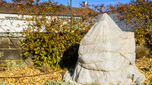 Устраивать защиту нужно с установлением стабильно отрицательной температуры воздуха — как правило, в начале ноября. После связывания ветвей небольшие кустики накрываем коробкой, старым ведром или ставим каркас, поверх которого оборачиваем светлый укрывной материал. Подробнее о зимней защите