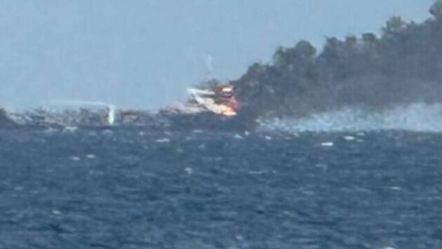 Сейчас на месте происшествия работают аварийно-спасательный катер, буксир и многоцелевой корабль, а пожарные тушат возгорание.
