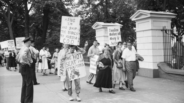 Последовали и другие рассказы. Толпа охотилась на левых. Прямо на знаменитой Таймс-сквер коммунистов избивали, топтали ногами. У нас немало писалось о казни на электрическом стуле Юлиуса и Этель Розенбергов, подозревавшихся в атомном шпионаже. Обвинения не были доказаны. Некоторые честные американцы выступали против казни. Но тысячи американцев, и об этом в СССР как-то не сообщалось, выходили в 1953-м на демонстрации с крупно выписанными лозунгами: "Забирайте их в Москву и хороните на вашей Красной площади".