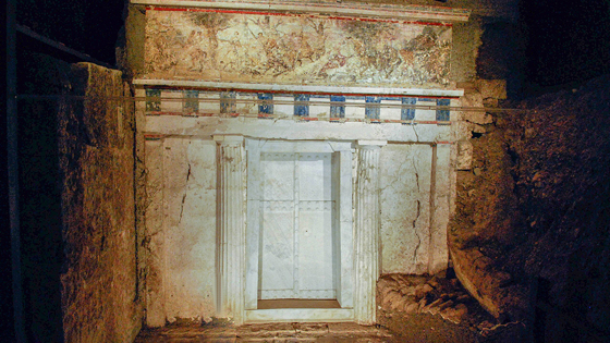 Еще один факт — изображение трех мужчин, нападающих на льва, на расписанном фризе гробницы. Греческий исследователь считает, охотник с копьем в пурпурном хитоне с белыми элементами — это Александр Македонский, а две фигуры рядом — его отец и брат. Кроме того, нарисованные рядом животные — это, скорее всего, джейраны из Персии. Видимо, на фризе изображена охота в Азии после похода Александра Македонского, значит, гробница принадлежит брату полководца, а не отцу, умершему до этих событий.