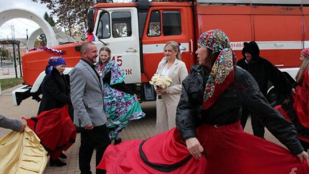 В Фатеже сыграли необычную свадьбу. Молодожены подъехали к ЗАГСу на пожарной машие А всё потому, что жених Михаил работает водителем в Фатежской пожарной части, он руководитель волонтёрской группы «Своих не бросаем», помогает нашим военнослужащим. Михаил и Елена Асмоловы сыграли сегодня свадьбу с пожарной машиной, медведем и голубями. Совет да любовь!