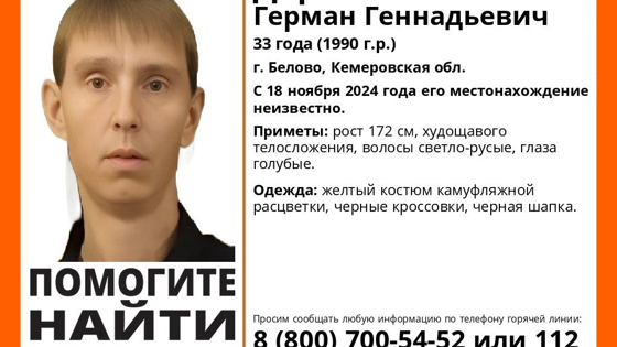 Приметы пропавшего 8 ноября молодого человека: рост 170 см, худощавое телосложение, каштановые волосы, серые глаза. На момент пропажи был одет в чёрный спортивный костюм с капюшоном, бежевую водолазку, воротом которой может быть закрыто лицо, серо-чёрные кроссовки.