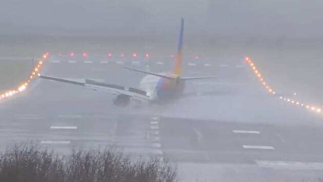 На кадрах видно, как пилоты пытаются справиться с сильным ветром во время шторма «Дарра», который обрушился на страну в минувшие выходные. Несмотря на непогоду, посадка прошла благополучно.