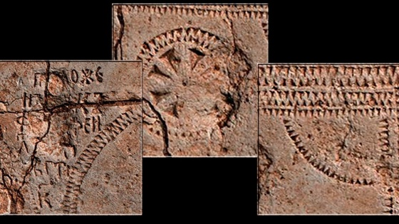 Орнамент по краям на поверхности найденной плиты состоит из двух рядов мелких треугольников, обращенных вершинами друг к другу. В верхней части плиты вырезан круг-розетка, а углы отсекают дуги из таких же рядов мелких треугольников. В средней части плиты находится еще одна розетка, от которой отходят две полукруглые боковые линии. Как полагают ученые, это символы, связанные с мотивом креста, неба и тела человека, которые традиционно наносили на надгробные плиты, начиная с домонгольского времени: в середине двумя полудугами обозначена грудная клетка человека, кружок-розетка над ней – голову, посредине, нижняя розетка – живот с узлом пояса или пряжка ремня.