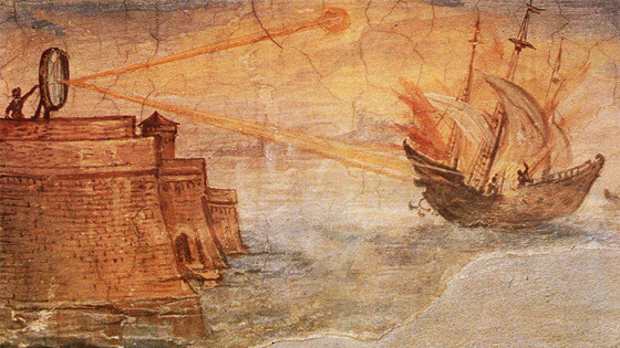 Однако более ранние авторы, такие как Полибий и Плутарх, описывали оборонительные машины Архимеды, но не упоминали зеркала. Это вызывает сомнение в исторической достоверности использования солнечного света в качестве оружия.