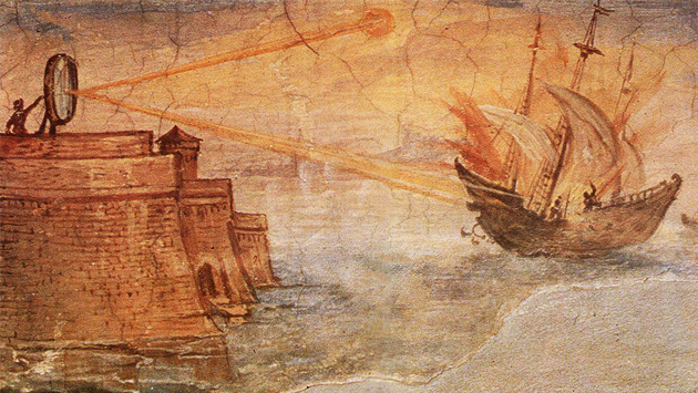 Согласно легенде, Архимед использовал зеркала или полированные металлические щиты, чтобы сфокусировать солнечные лучи на римлянских кораблях. Концентрированный свет нагревал деревянные корпуса, закрывая смолой и вызывая их возгорание. Этот метод мог бы быть эффективным при ясной погоде и точном освещении.