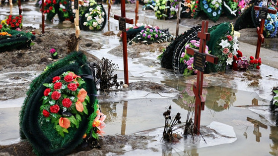 Участок Цветковского кладбища затопило из-за таяния снега. Могилы, на которых ещё не успели поставить памятники, ушли под воду. Территорию пытались осушить три дня.