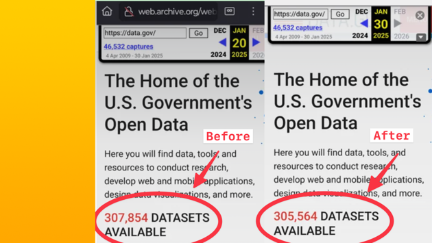 Тысячи наборов данных были удалены с сайта Data.gov, главного онлайн-хранилища правительственных данных США, после вступления Дональда Трампа в должность. Исследователи и архивисты заметили, что с 21 января по конец января исчезло более 2000 наборов данных, причем многие из них пропали сразу после инаугурации Трампа.